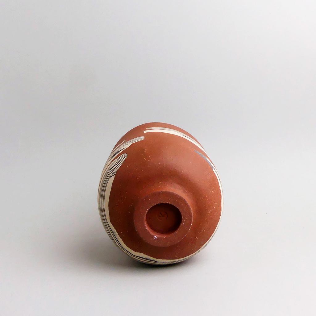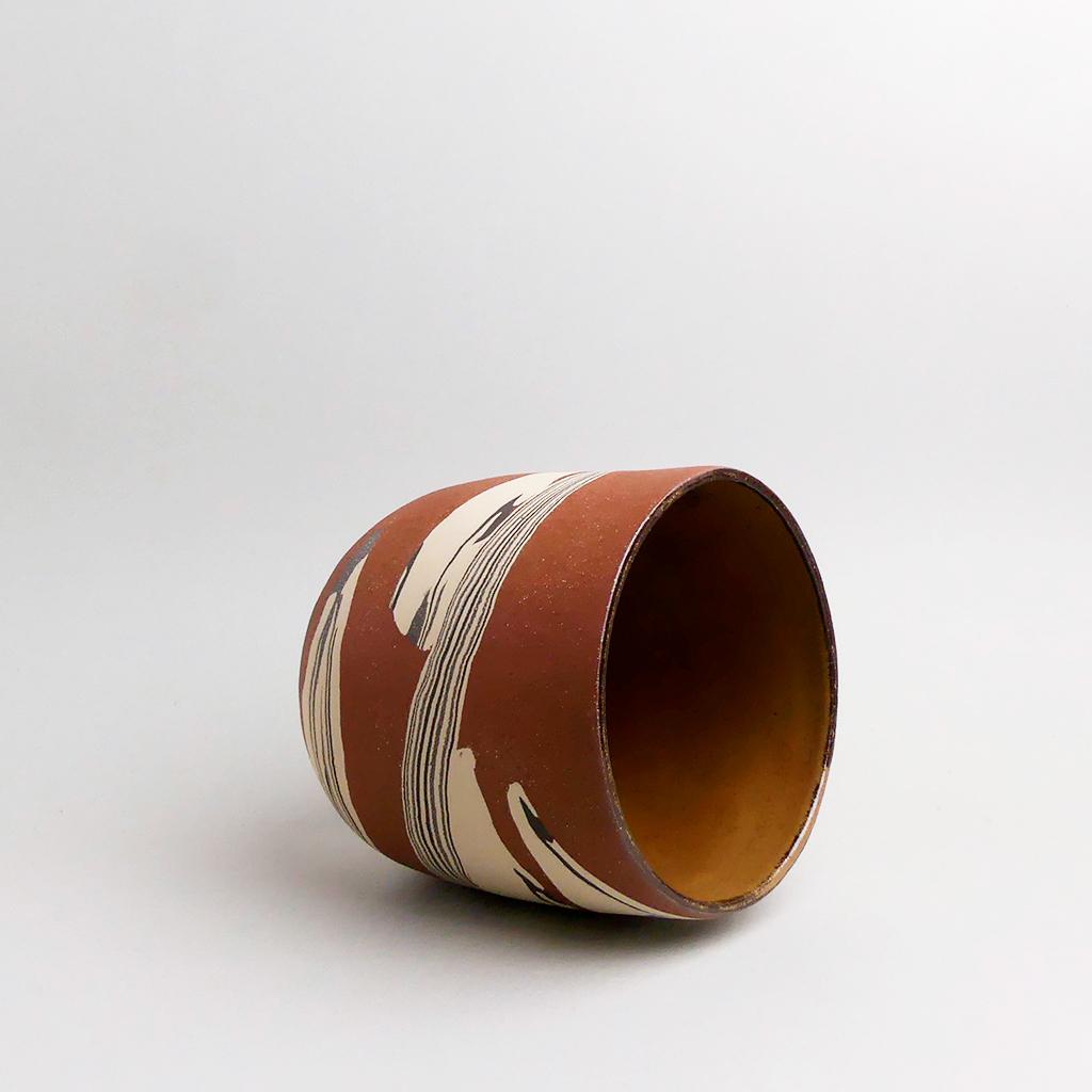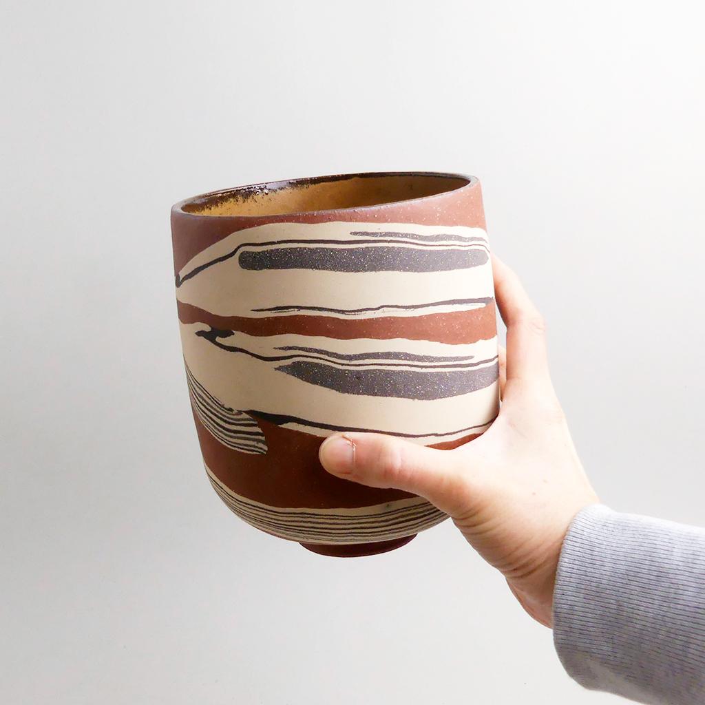 Die Basis des Übertopfes ist aus rotbraunem Ton hergestellt. In diesen wurden dann geschichtete Elemente aus creme- und anthrazitfarbenem Ton eingearbeitet. Die kontrastierenden Erd- und Sandtöne verlaufen in sanften, organischen Streifen um das Gefäß und verleihen ihm eine besondere, strukturierte Optik. Die matte, leicht raue Außenseite unterstreicht die rohe, handwerkliche Ästhetik, während die Innenseite mit einer glatten, goldbraunen Glasur versehen ist.