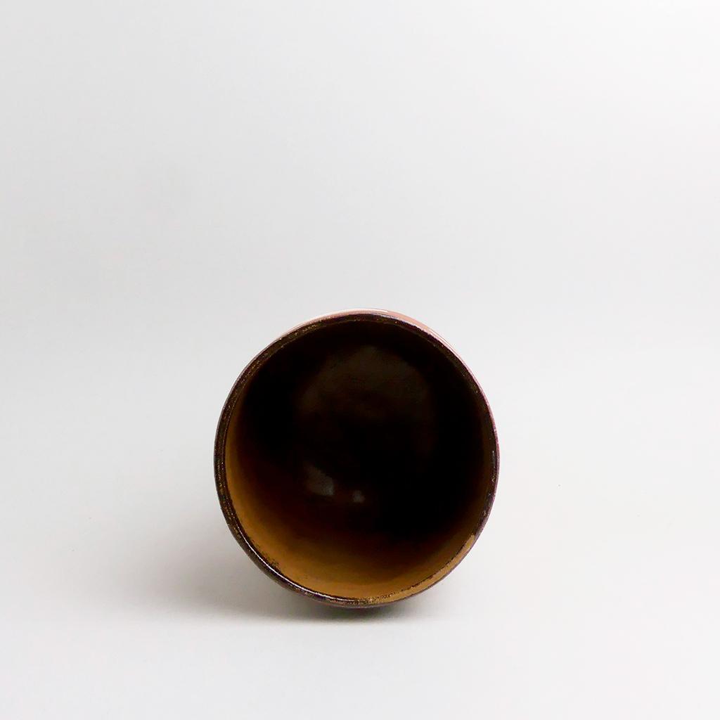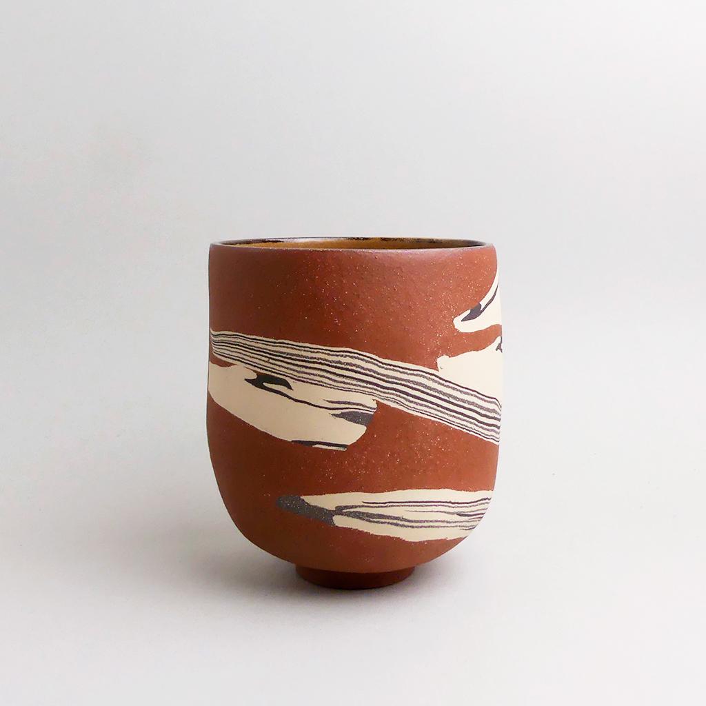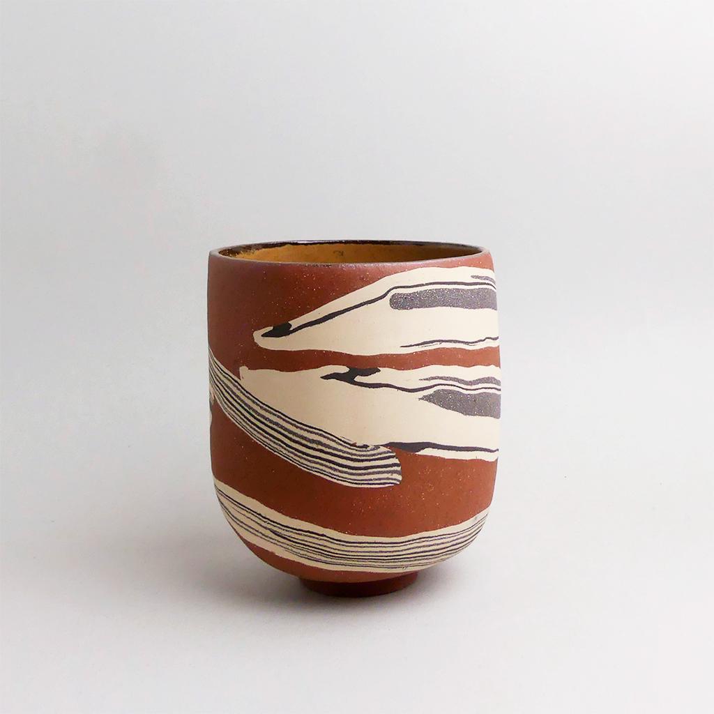 Die Basis des Übertopfes ist aus rotbraunem Ton hergestellt. In diesen wurden dann geschichtete Elemente aus creme- und anthrazitfarbenem Ton eingearbeitet. Die kontrastierenden Erd- und Sandtöne verlaufen in sanften, organischen Streifen um das Gefäß und verleihen ihm eine besondere, strukturierte Optik. Die matte, leicht raue Außenseite unterstreicht die rohe, handwerkliche Ästhetik, während die Innenseite mit einer glatten, goldbraunen Glasur versehen ist.