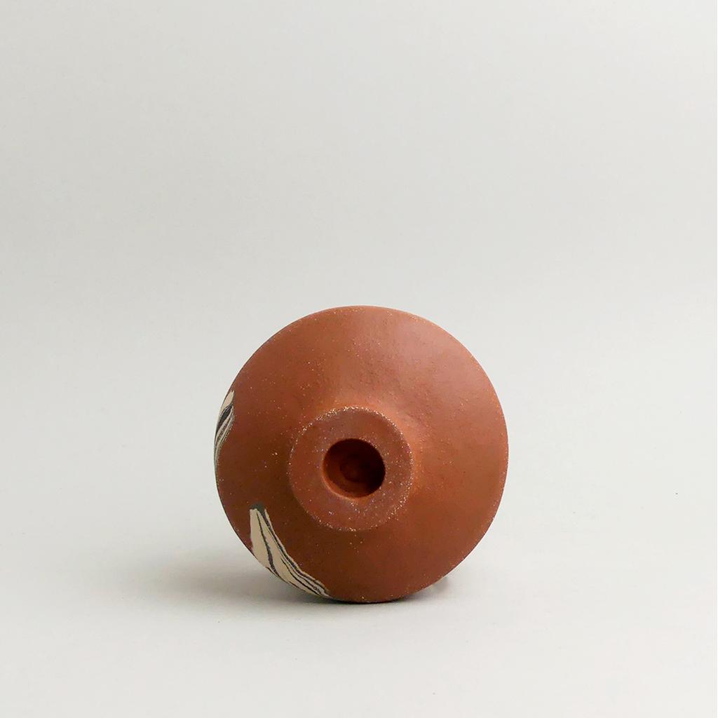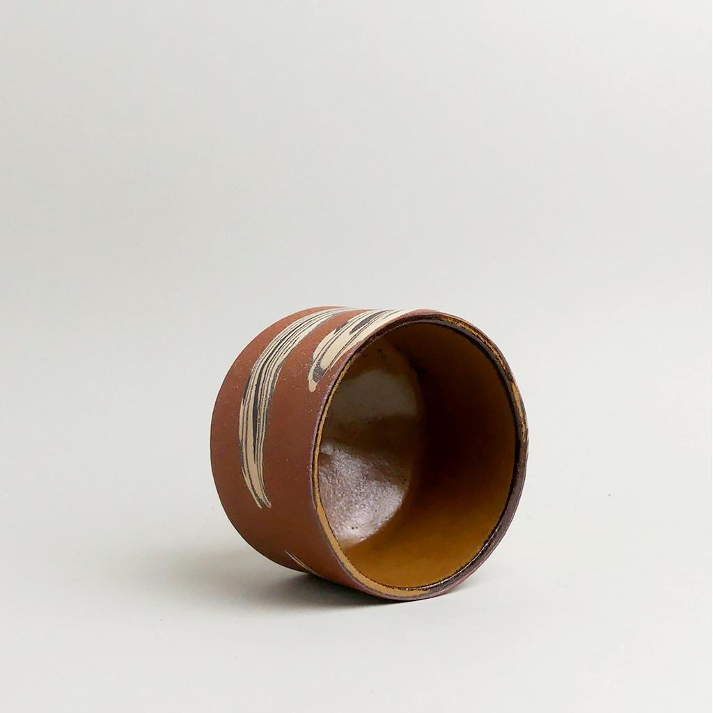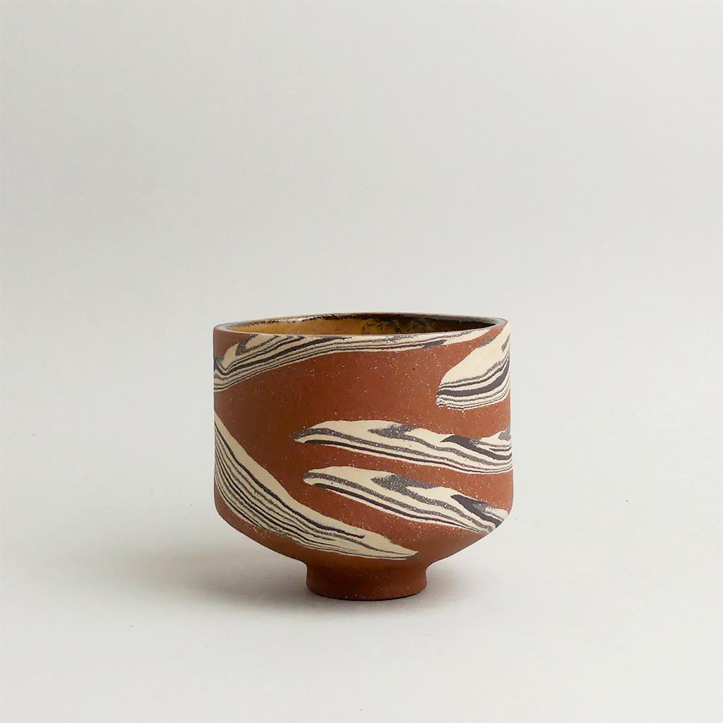 Die Basis des Übertopfes ist aus rotbraunem Ton hergestellt. In diesen wurden dann geschichtete Elemente aus schwarzem und sandfarbenem Ton eingearbeitet. Die kontrastierenden Erd- und Sandtöne verlaufen in sanften, organischen Streifen um das Gefäß und verleihen ihm eine besondere, strukturierte Optik. Die matte, leicht raue Außenseite unterstreicht die rohe, handwerkliche Ästhetik, während die Innenseite mit einer glatten, schokoladenbraunen Glasur versehen ist.