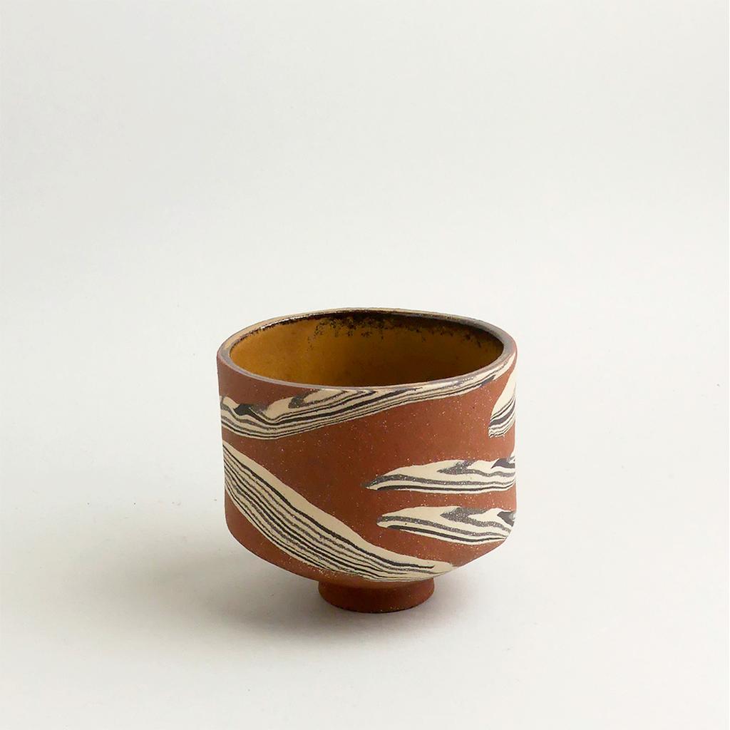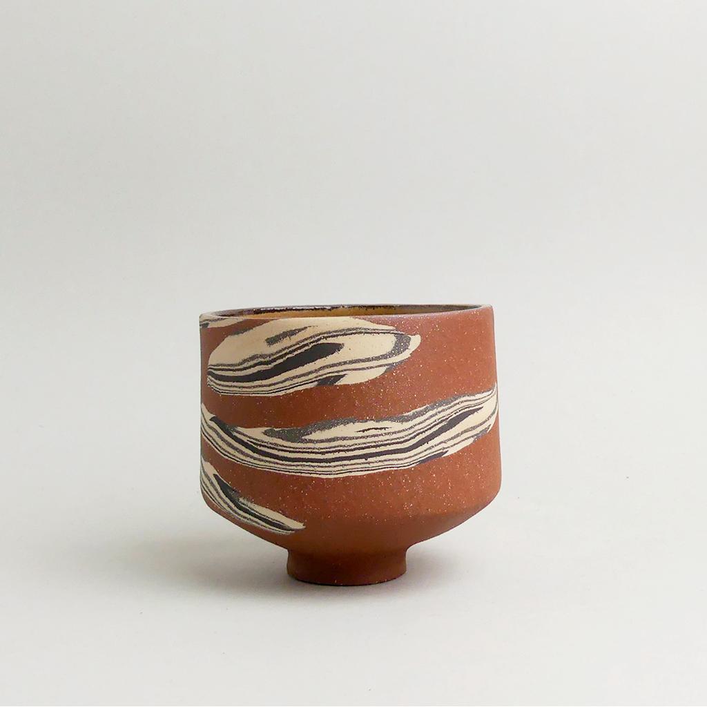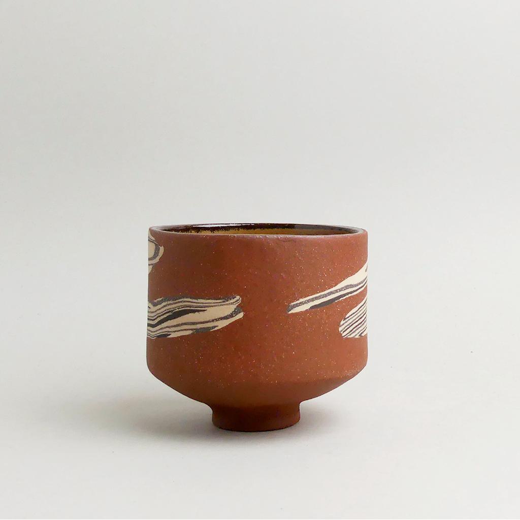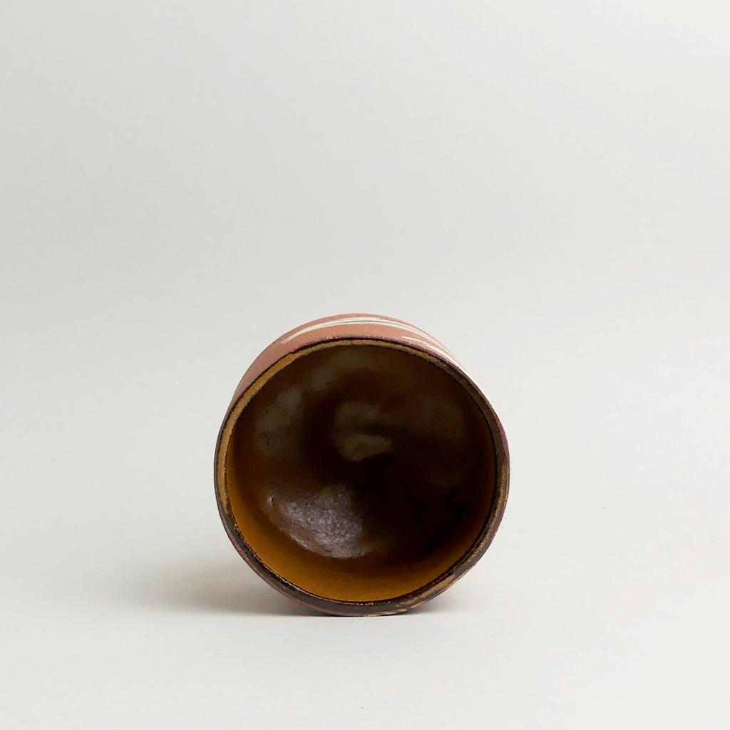 Die Basis des Übertopfes ist aus rotbraunem Ton hergestellt. In diesen wurden dann geschichtete Elemente aus schwarzem und sandfarbenem Ton eingearbeitet. Die kontrastierenden Erd- und Sandtöne verlaufen in sanften, organischen Streifen um das Gefäß und verleihen ihm eine besondere, strukturierte Optik. Die matte, leicht raue Außenseite unterstreicht die rohe, handwerkliche Ästhetik, während die Innenseite mit einer glatten, schokoladenbraunen Glasur versehen ist.