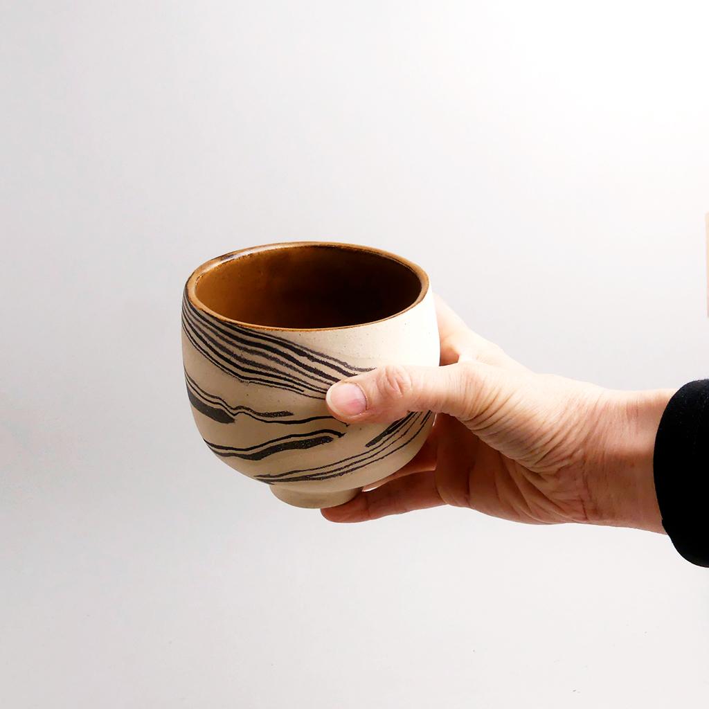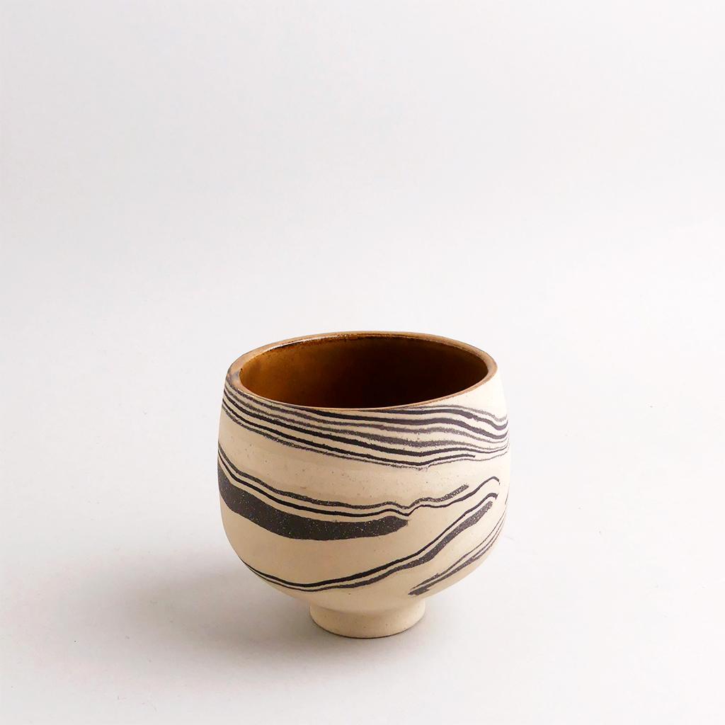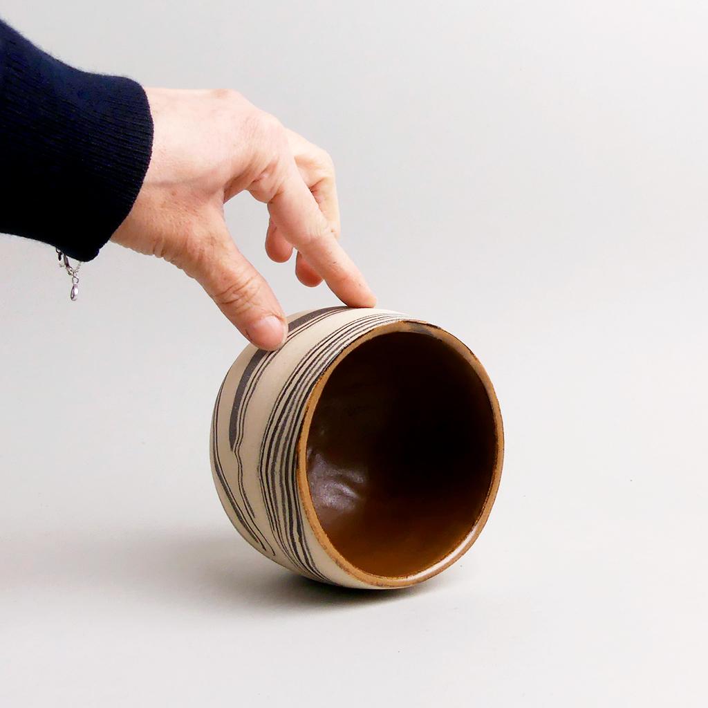 Die Basis des Übertopfes ist aus cremefarbenem Ton hergestellt. In diesen wurden dann geschichtete Elemente aus schwarzem und weissem Ton eingearbeitet. Die kontrastierenden Töne verlaufen in sanften, organischen Streifen um das Gefäß und verleihen ihm eine besondere, strukturierte Optik. Die matte, leicht raue Außenseite unterstreicht die rohe, handwerkliche Ästhetik, während die Innenseite mit einer glatten, schokoladenbraunen Glasur versehen ist.