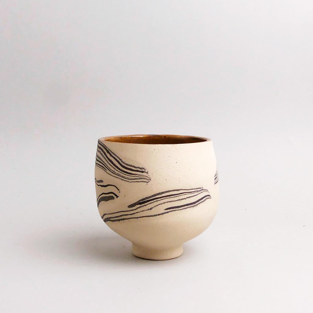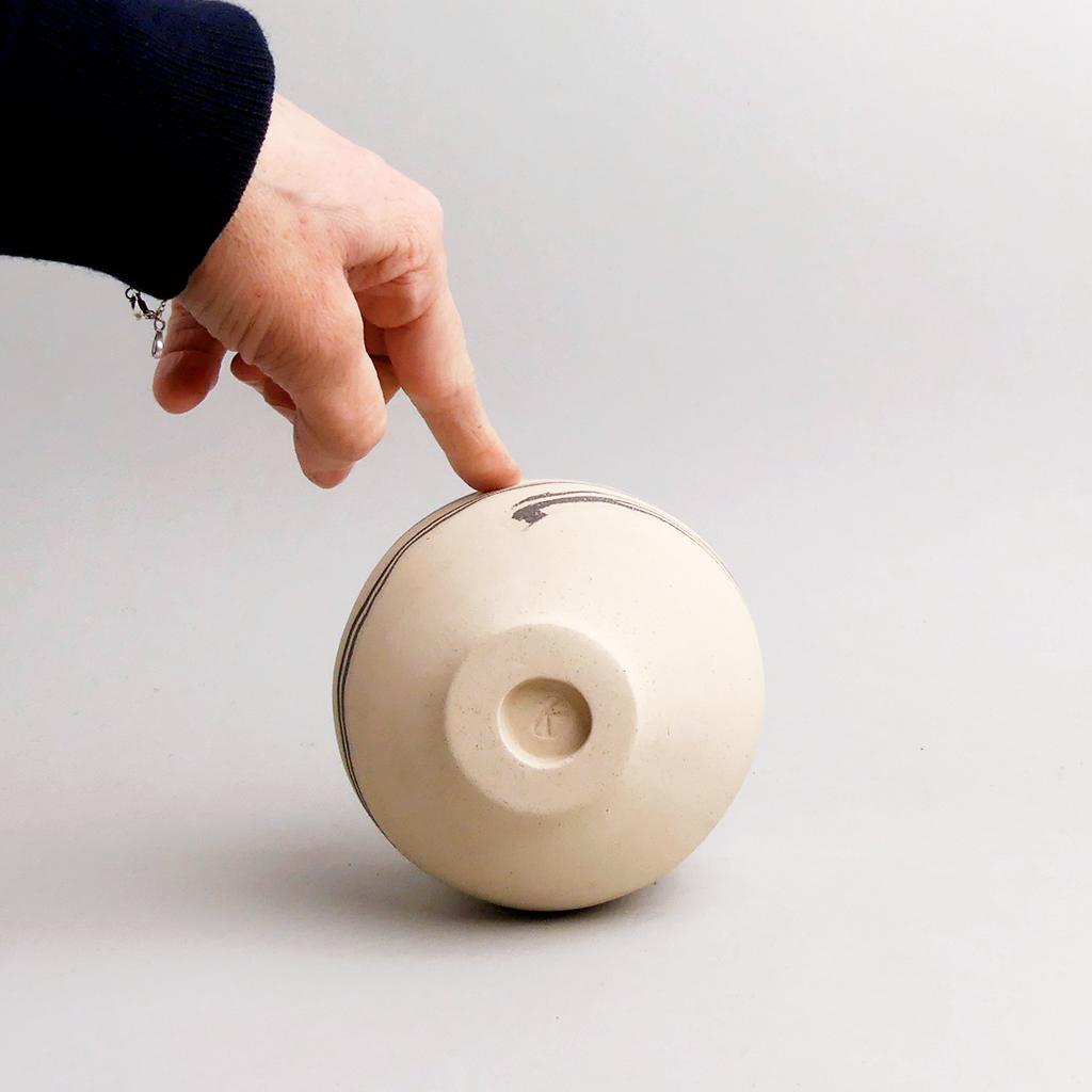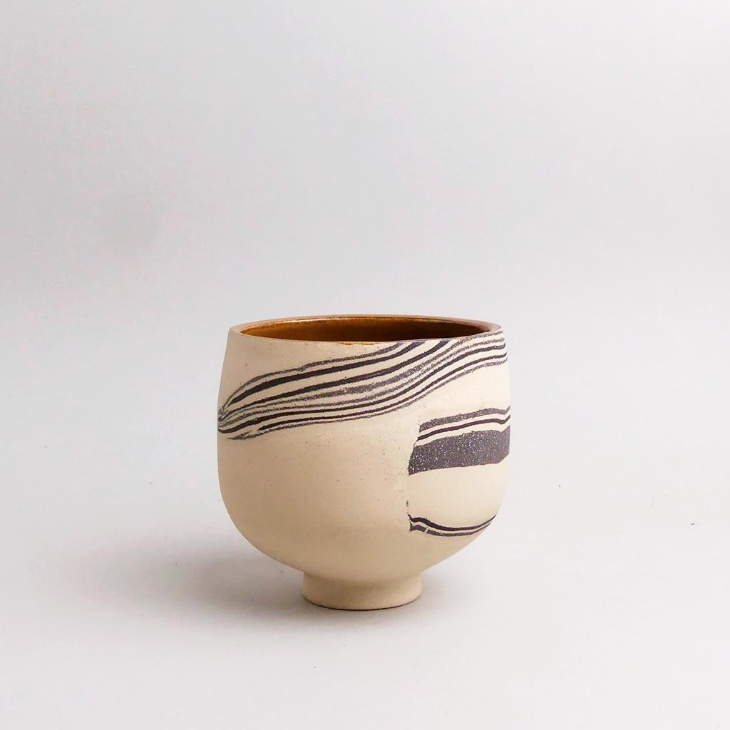 Die Basis des Übertopfes ist aus cremefarbenem Ton hergestellt. In diesen wurden dann geschichtete Elemente aus schwarzem und weissem Ton eingearbeitet. Die kontrastierenden Töne verlaufen in sanften, organischen Streifen um das Gefäß und verleihen ihm eine besondere, strukturierte Optik. Die matte, leicht raue Außenseite unterstreicht die rohe, handwerkliche Ästhetik, während die Innenseite mit einer glatten, schokoladenbraunen Glasur versehen ist.