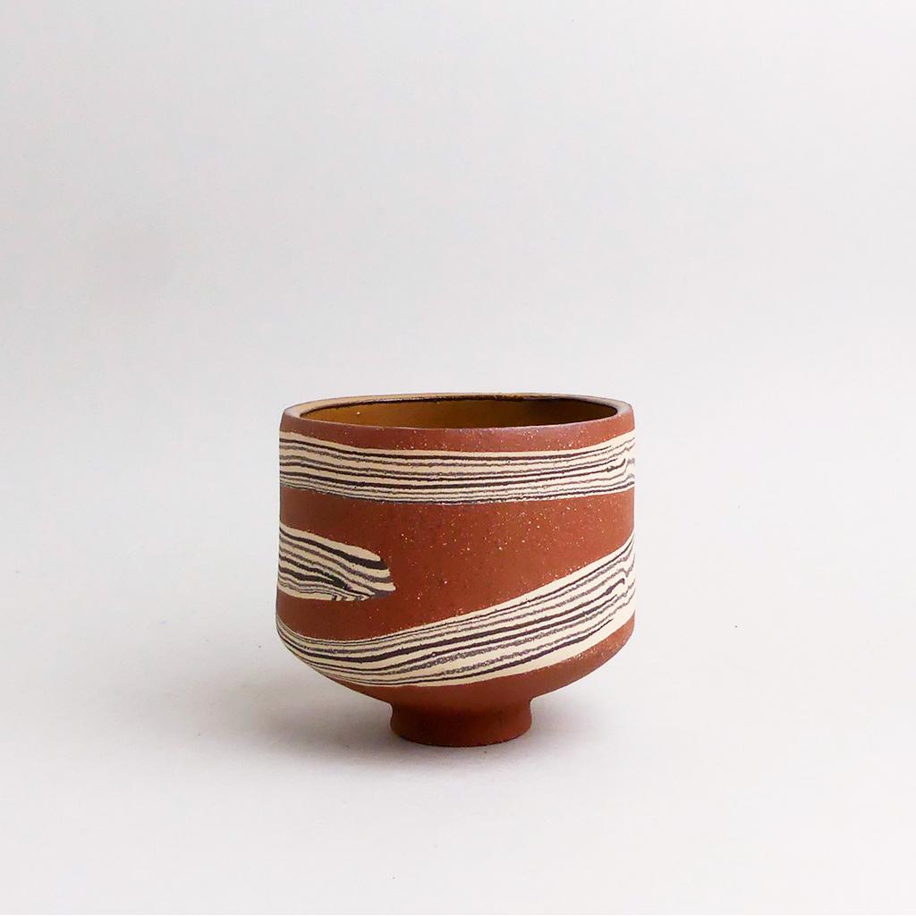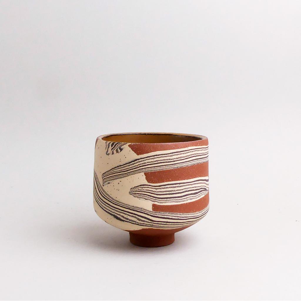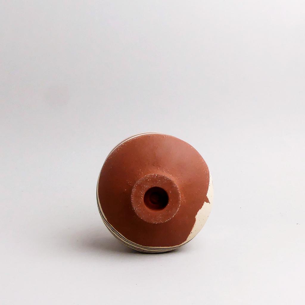 Die Basis des Übertopfes ist aus rotbraunem Ton hergestellt. In diesen wurden dann geschichtete Elemente aus schwarzem und sandfarbenem Ton eingearbeitet. Die kontrastierenden Erd- und Sandtöne verlaufen in sanften, organischen Streifen um das Gefäß und verleihen ihm eine besondere, strukturierte Optik. Die matte, leicht raue Außenseite unterstreicht die rohe, handwerkliche Ästhetik, während die Innenseite mit einer glatten, schokoladenbraunen Glasur versehen ist.