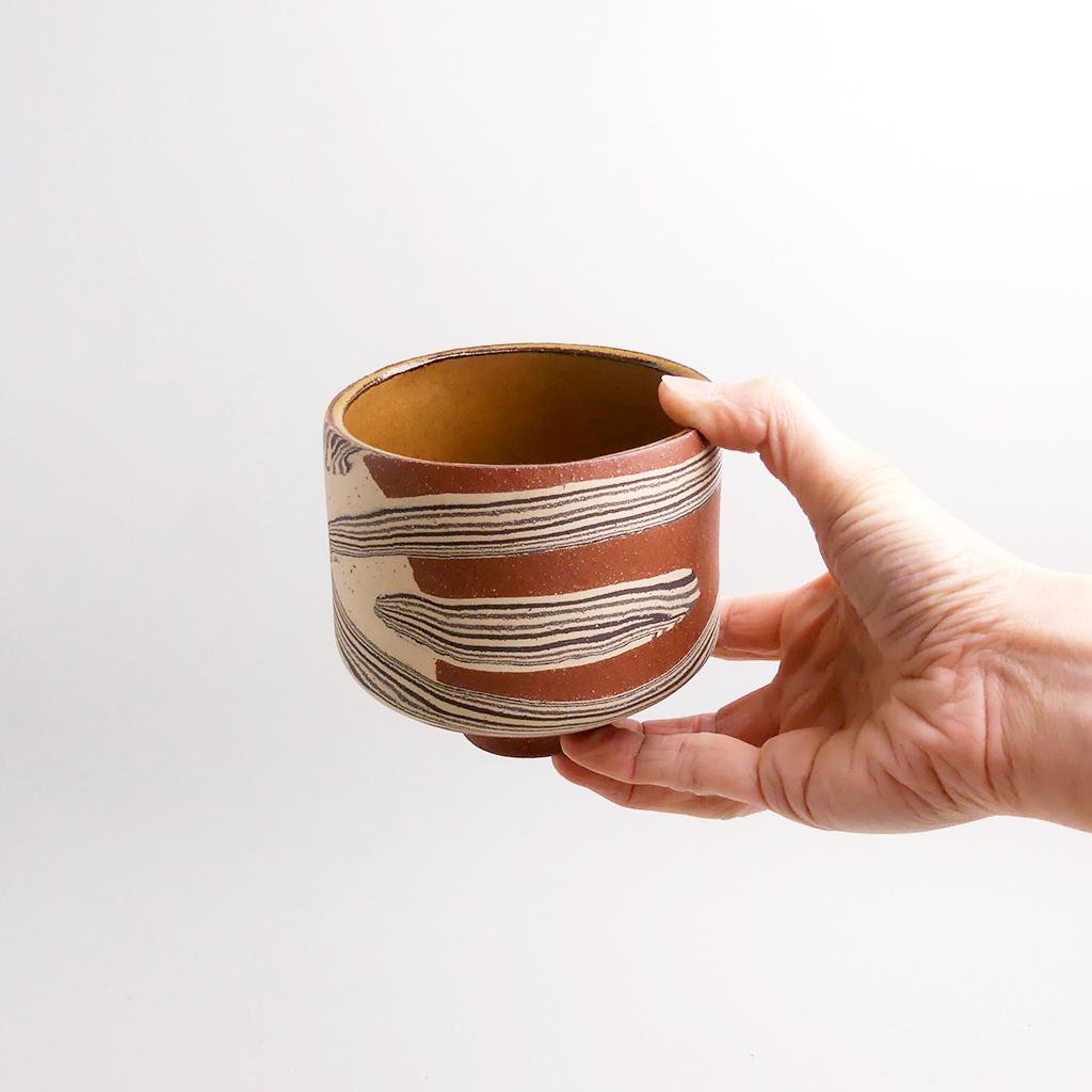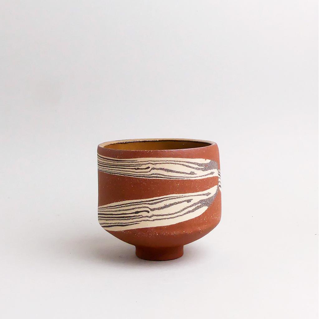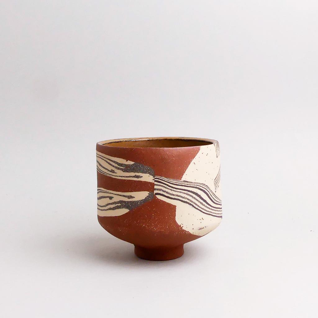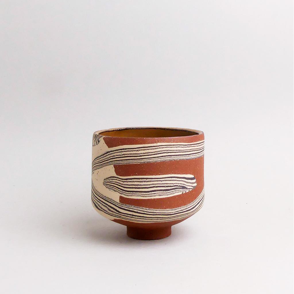 Die Basis des Übertopfes ist aus rotbraunem Ton hergestellt. In diesen wurden dann geschichtete Elemente aus schwarzem und sandfarbenem Ton eingearbeitet. Die kontrastierenden Erd- und Sandtöne verlaufen in sanften, organischen Streifen um das Gefäß und verleihen ihm eine besondere, strukturierte Optik. Die matte, leicht raue Außenseite unterstreicht die rohe, handwerkliche Ästhetik, während die Innenseite mit einer glatten, schokoladenbraunen Glasur versehen ist.