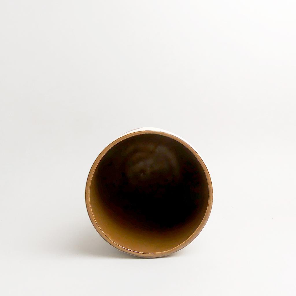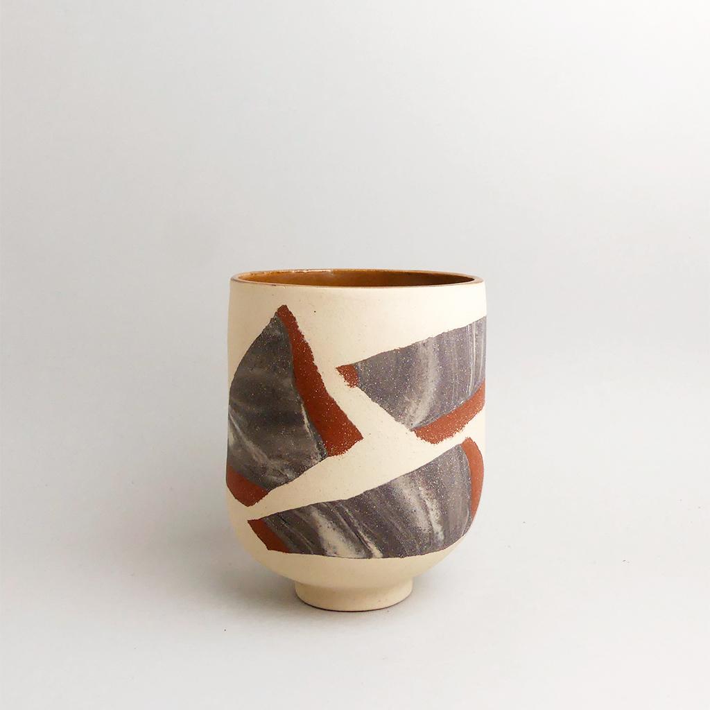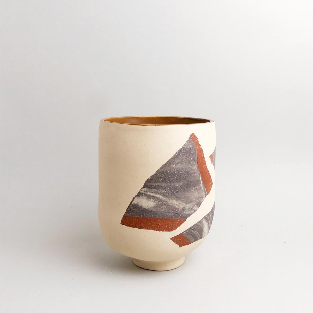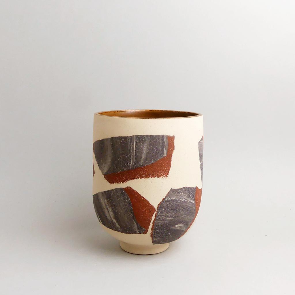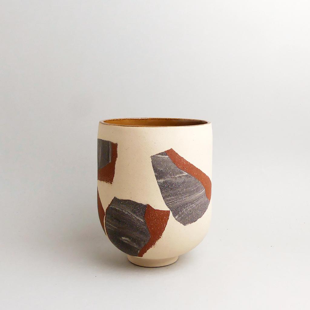 Der Übertopf ist aus cremefarbenem Ton gefertigt und bildet eine ruhige, homogene Grundstruktur. Auf dieser Basis sind klar abgegrenzte, polygonale Farbsegmente in Rotbraun appliziert, die sich als grafische Flächen um den Korpus legen. Eine zentral positionierte, marmorierte Zone durchbricht die Fläche und erzeugt eine reliefartige Dynamik. Die matte, leicht raue Außenseite unterstreicht die rohe, handwerkliche Ästhetik, während die Innenseite mit einer glatten, schokoladenbraunen Glasur versehen ist.