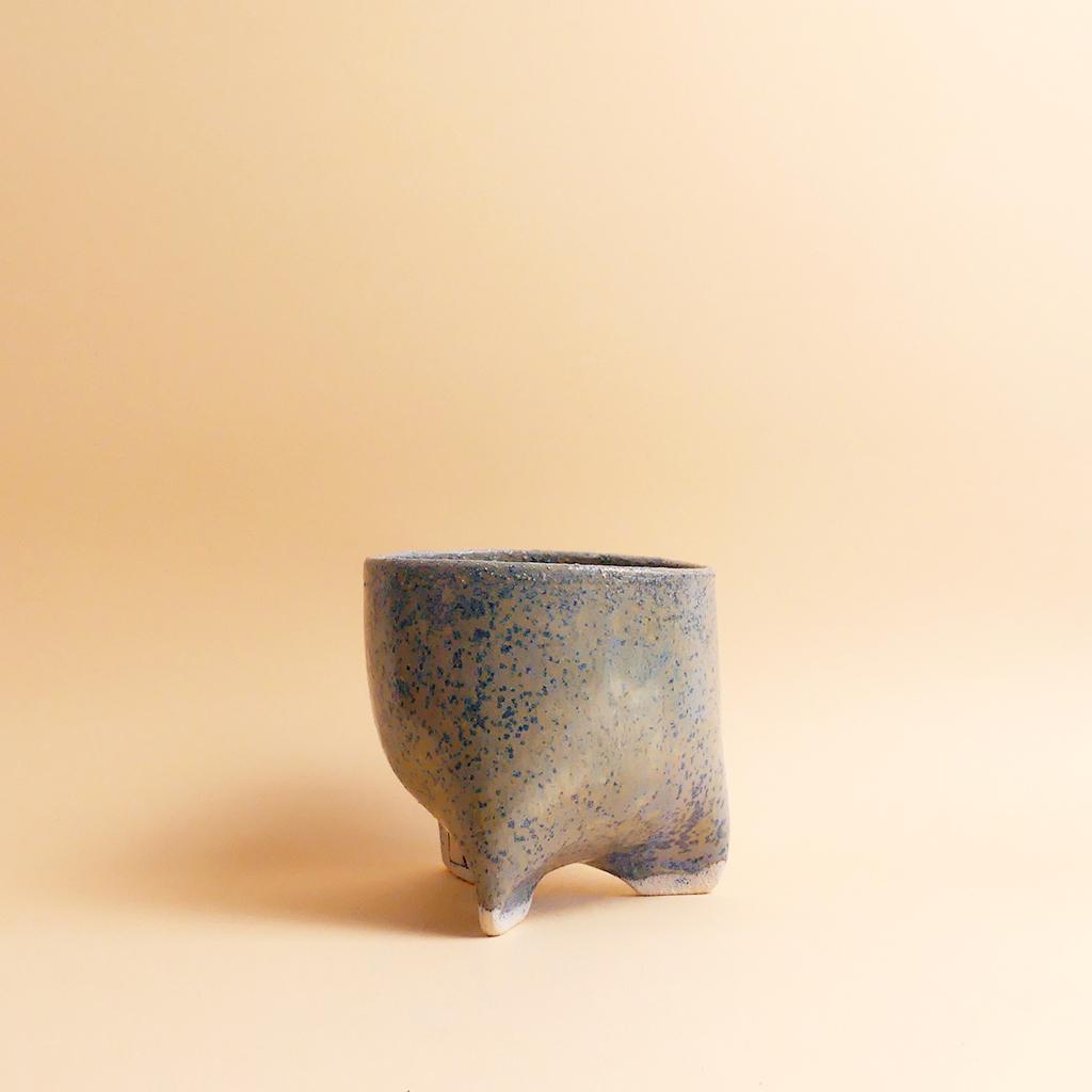 Die Form des Pflanztopfes von Caution Fragile Ceramic ist schlicht und leicht konisch - und erinnert ein bisschen an einen Zahn. Getragen wird er von kleinen, integrierten, leicht gedrehten Füßen, die dem Topf eine leichte, fast schwebende Wirkung geben. Die Glasur ist helllgrün mit kleinen, blauen Pünktchen, die sich unregelmäßig über die Oberfläche ziehen. Im unteren Bereich bleibt der helle Ton der Keramik sichtbar. Dort ist auch das Logo von Caution Fragile Ceramics angebracht.