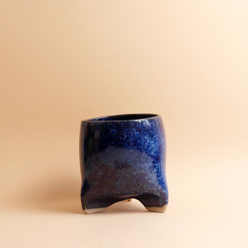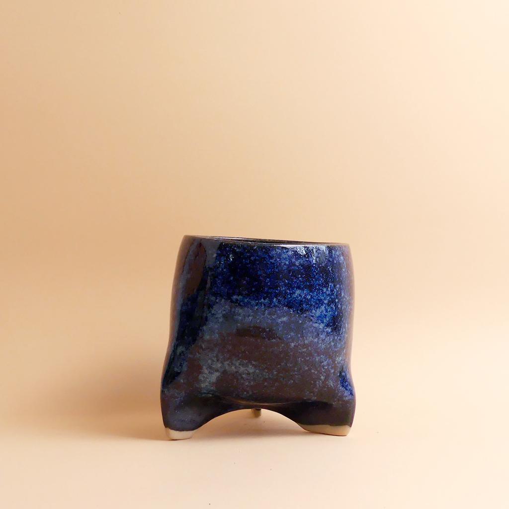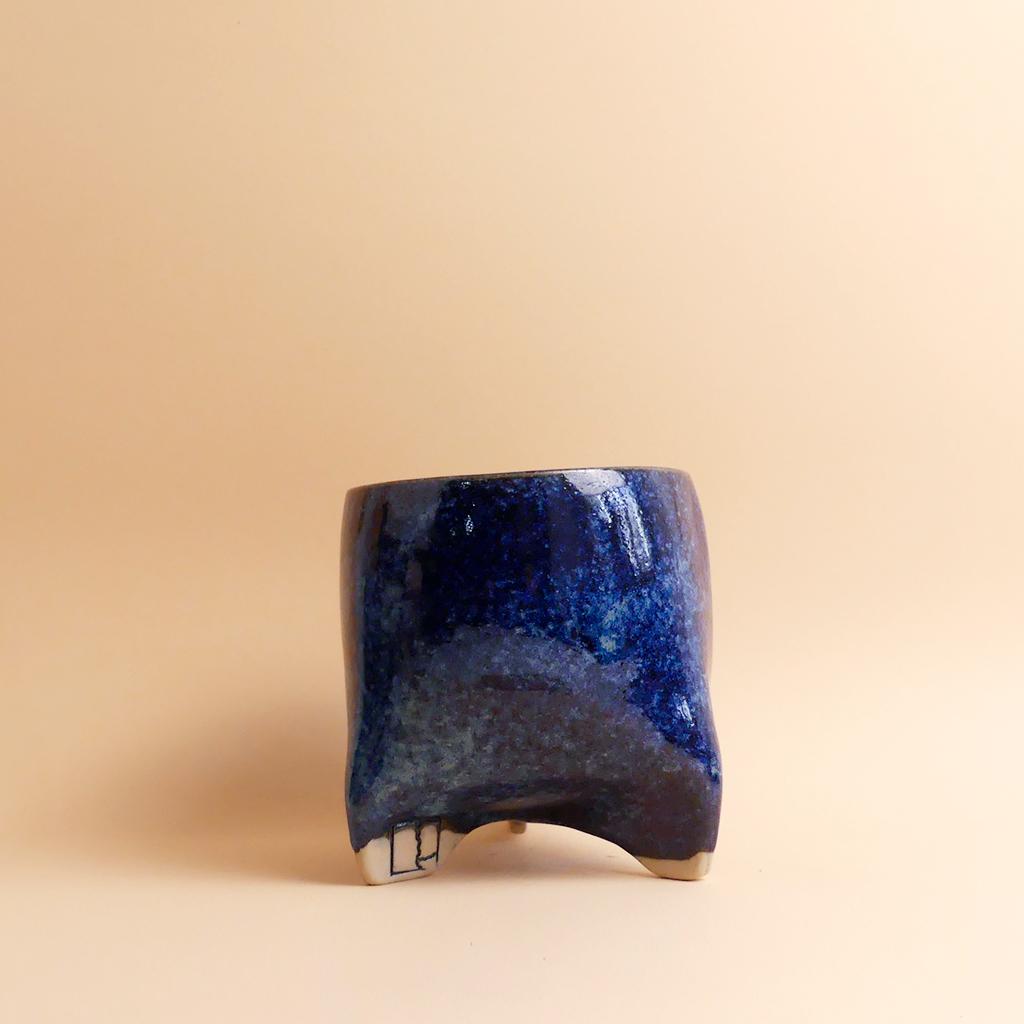 Die Form des Pflanztopfes von Caution Fragile Ceramic ist schlicht und leicht konisch - und erinnert ein bisschen an einen Zahn. Getragen wird er von kleinen, integrierten, leicht gedrehten Füßen, die dem Topf eine leichte, fast schwebende Wirkung geben. Die Glasur zeigt dunkle Blautöne mit wolkigen Verläufen, die sich über die Oberfläche ziehen. Im unteren Bereich bleibt der helle Ton der Keramik sichtbar. Dort ist auch das Logo von Caution Fragile Ceramics angebracht.