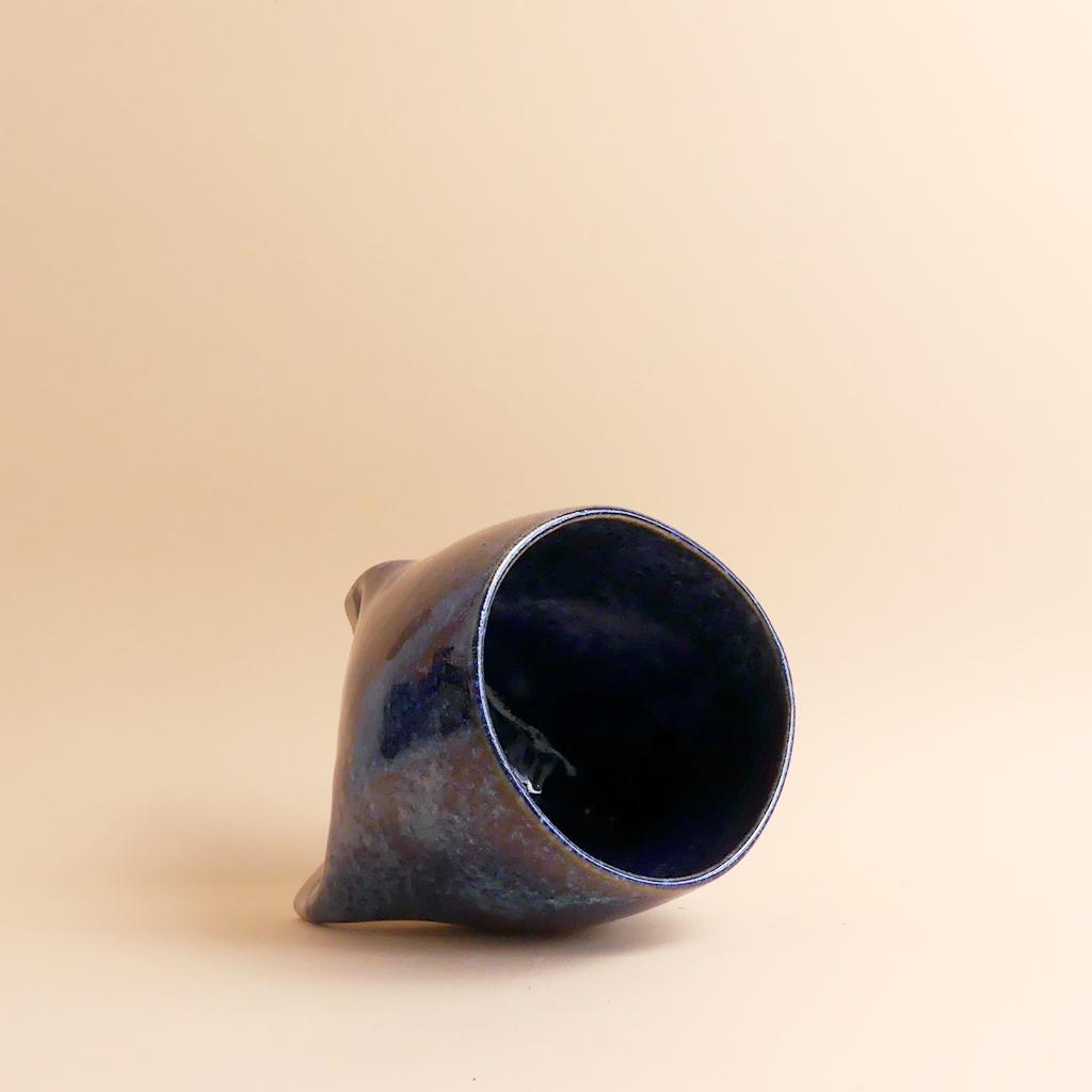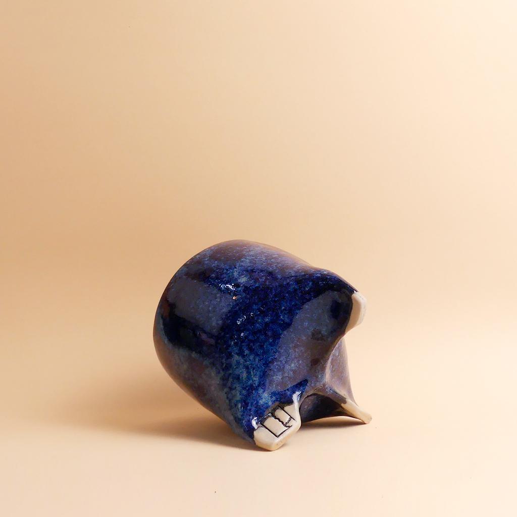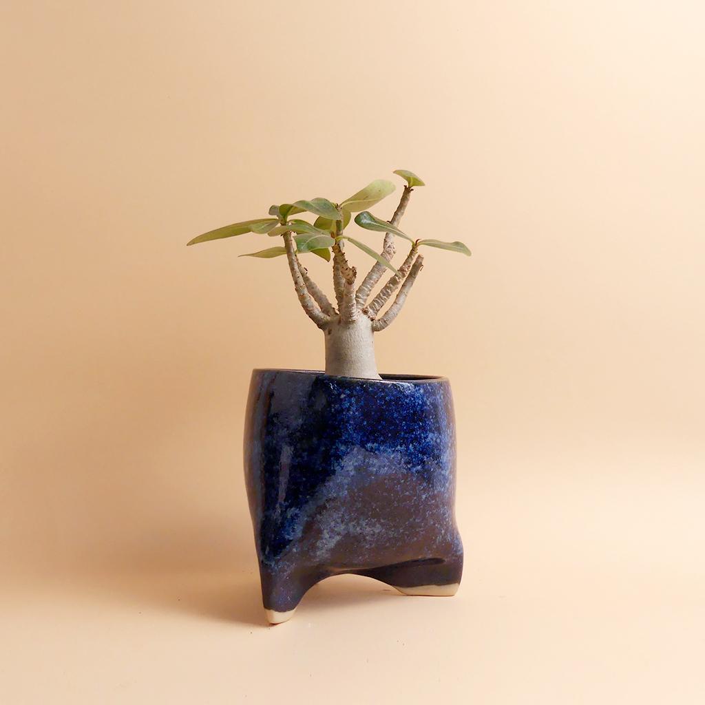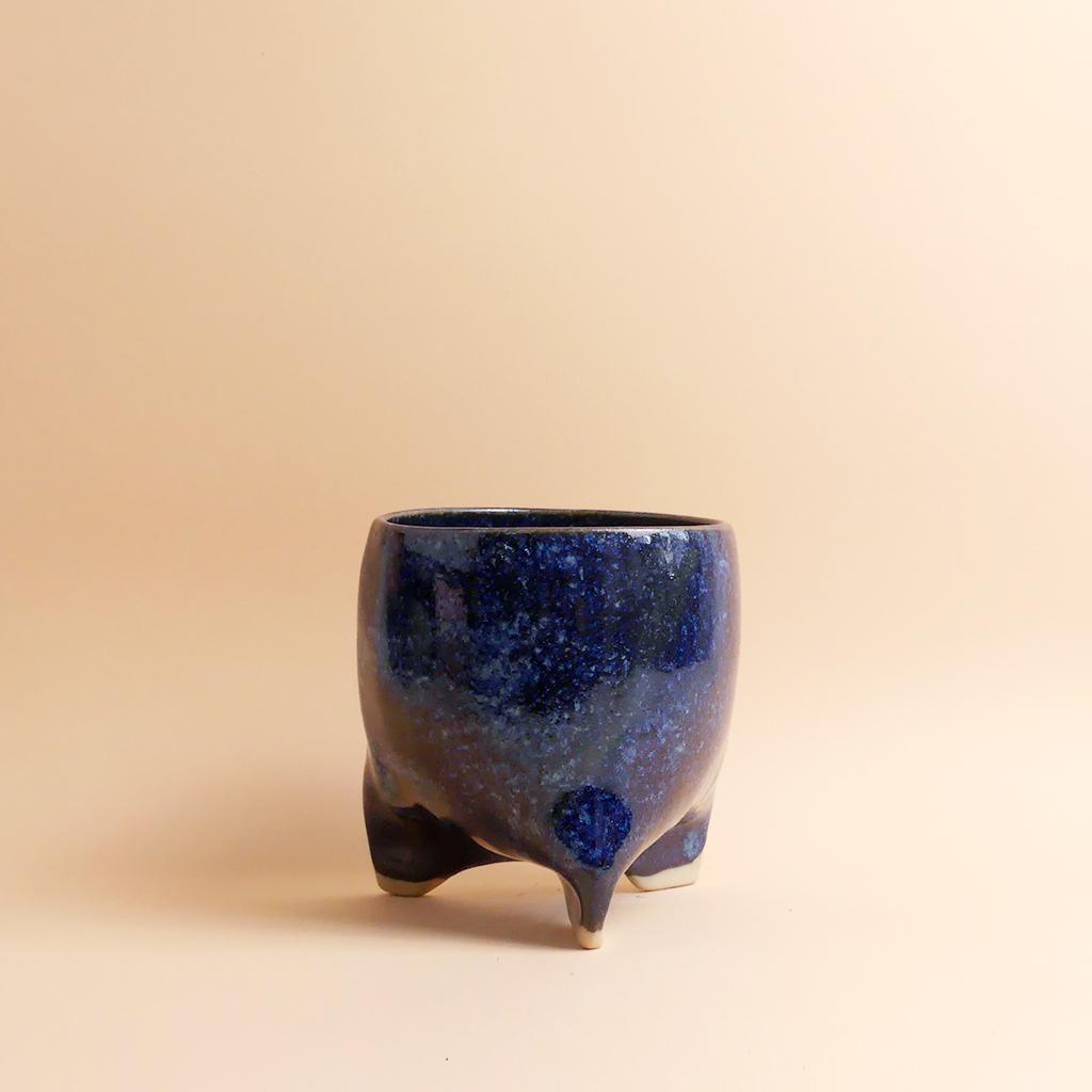 Die Form des Pflanztopfes von Caution Fragile Ceramic ist schlicht und leicht konisch - und erinnert ein bisschen an einen Zahn. Getragen wird er von kleinen, integrierten, leicht gedrehten Füßen, die dem Topf eine leichte, fast schwebende Wirkung geben. Die Glasur zeigt dunkle Blautöne mit wolkigen Verläufen, die sich über die Oberfläche ziehen. Im unteren Bereich bleibt der helle Ton der Keramik sichtbar. Dort ist auch das Logo von Caution Fragile Ceramics angebracht.