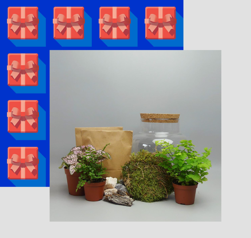 Ein liebevoll zusammengestelltes Do-it-yourself-Set, mit dem man ein geschlossenes Mini-Ökosystem zuhause selbst baut. Das Set enthält Glasgefäß, Korkverschluss, Tongranulat, Aktivkohle, Erde, Moos, Kieselsteine und lebende Pflanzen plus eine bebilderte Anleitung.
