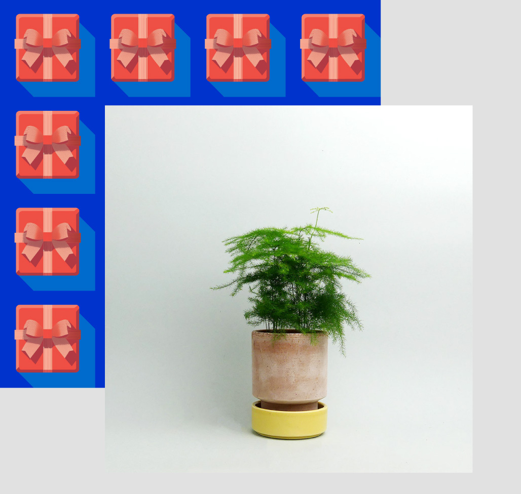 Dieses sorgfältig kuratierte Set kombiniert eine luftige, elegante Zimmerpflanze Asparagus setaceus mit dem matten, zylindrischen Terrakotta-Topf „Hoff Pot“ von Bergs Potter — inklusive glasiertem gelben Untersetzer.
